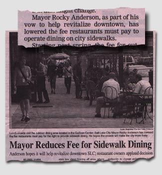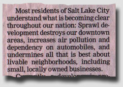 - We have the opportunity now to choose what kind of community we want to be. Do we want to be more like so many look-alike communities, with door-to-door national chain-stores? Or do we want to go the way of communities like Boulder, Colorado, which have committed themselves to smart, quality growth? Boulder was recently honored by the National Trust for Historic Preservation as one of twelve communities that, as described in an editorial in the Boulder Dailey Camera, "worked hard and smart at preserving their sense of place and character, cities that have not surrendered their heart and soul to the lure of growth and wealth...These towns epitomize the flip side of sprawl..." Salt Lake City will only be described in such glowing terms if we have the courage to oppose sprawl-inducing, soulless projects like the mega mall.