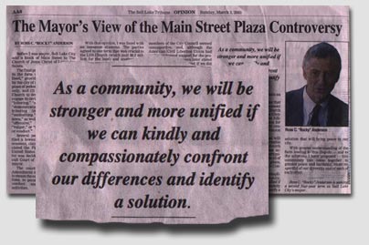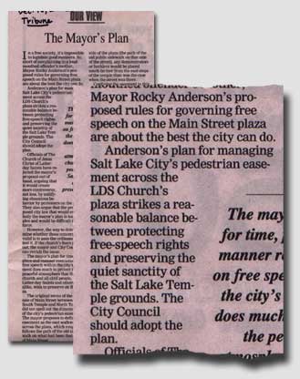 Before I was mayor, Salt Lake City sold a block of Main Street to The Church of Jesus Christ of Latter-day Saints. (For ease of reference, and pursuant to the protocol of The Church of Jesus Christ of Latter-day Saints, that organization will be referred to hereafter as "The Church.") The final purchase/sale agreement, in the form of a "Special Warranty Deed" provided for (1) the retention by the City of an easement for the purposes of pedestrian access and passage only and (2) authority by The Church to deny access to those who engage in certain activities, including "loitering," "assembling," "partying," "demonstrating," "picketing," "distributing literature," "soliciting," "sunbathing," and "carrying firearms," as well as those who engage in "offensive," "indecent," "obscene," "vulgar," or "disorderly speech, dress or conduct."